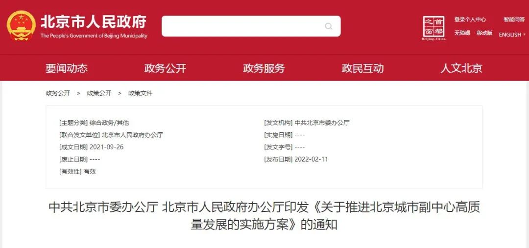 文件《关于推进北京城市副中心高质量发展的实施方案》